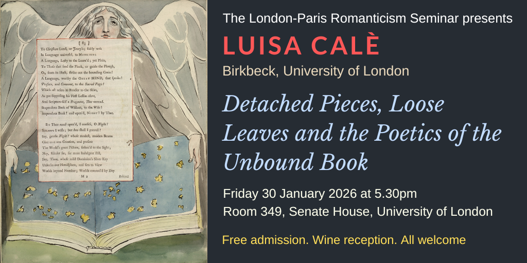 The next meeting of the London-Paris Romanticism Seminar will take place on Friday 30 January 2026 in Room 349 (third floor), Senate House, University of London, starting at 5.30 pm. As our distinguished guest speaker, we are delighted to welcome Professor Luisa Calè of Birkbeck, University of London, who will present a paper entitled Detached Pieces, Loose Leaves and the Poetics of the Unbound Book. This will be followed by a discussion and wine reception. The seminar will be chaired by David Duff (Queen Mary University of London).